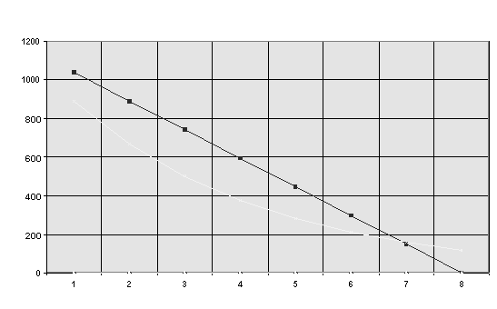 Из таблиц и из графиков видно, что при расчёте амортизационных отчислений линейным способом возмещение основных фондов производится равными частями ежегодно в течение всего срока эксплуатации (в течение восьми лет). Эти ежегодные отчисления равны 1482 рубля или 12,5%.