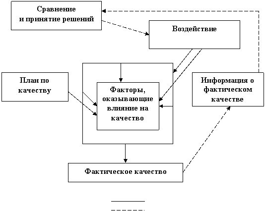 По универсальной схеме работают все, но наиболее часто рабочие, мастера, контролеры ОТК. Для них план по качеству заключен в чертежах, технологических операционных и контрольных картах. Они сами непосредственно производят сравнение фактических и заданных в технологической документации параметров качества сами, как правило, принимают решение о том, каким способом, приемом ликвидировать отклонение. Здесь механизм управления качеством находится в руках работника и деятельность его зависит от профессиональных навыков и знаний. Он как бы заложен в самом работнике и тех условиях, в которых ему приходится трудится.