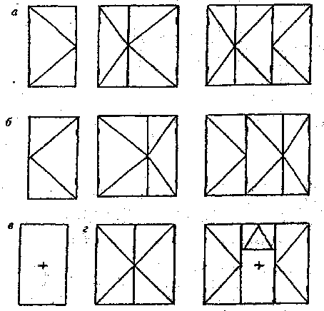 а - оконные блоки левого открывают; 6 - оконные блоки правого открывания; в - не открывающийся оконный блок; г - оконные блоки симметричного открывания