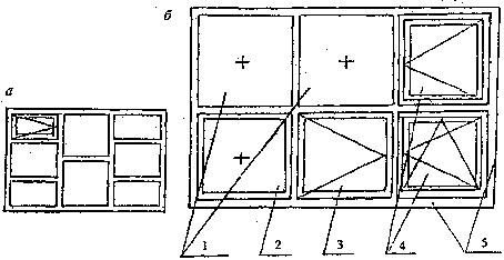 a - пример деревянной оконной рамы для остекления веранды; б - пример металлической рамы с различными видами заполнения конструкции: 1 - стеклопакетами; 2 - не открывающейся створкой (или остекленной коробкой); 3 - открывающейся (распашной) створкой; 4 - оконными блоками; 5 - рама