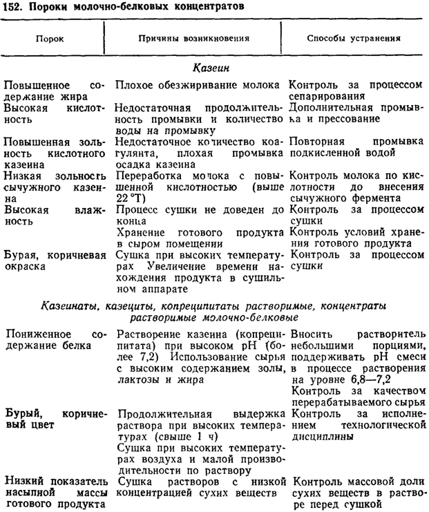 Пороки молочно-белковых концентратов возникают как результат использования недоброкачественного исходного сырья, отклонений от рекомендованных технологических режимов и условии хранения готового продукта. В табл. 152 приведены пороки молочно-белковых концентратов и способы их устранения.