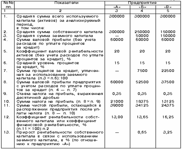 Из результатов проведенных расчетов видно, что чем выше удельный вес заемных средств в общей сумме используемого предприятием капитала, тем больший уровень прибыли оно получает на собственный капитал. Вместе с тем необходимо обратить внимание на зависимость эффекта финансового левериджа от соотношения коэффициента рентабельности активов и уровня процентов за использование заемного капитала. Если коэффициент валовой рентабельности активов больше уровня процентов за кредит, то эффект финансового левериджа положительный. При равенстве этих показателей эффект финансового левериджа равен нулю. В случае же превышения уровня процентов за кредит над коэффициентом валовой рентабельности активов эффект финансового левериджа получается отрицательным.