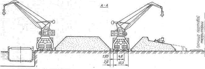 На причалах погрузки навалочных грузов в суда (уголь, руда и др.) грузоподъемность кранов ограничивается 10 т, так как при грейферной разгрузке вагонов использование кранов грузоподъемностью 16т приводит к их поломке, а применение грейферов пониженной вместимости — к недоиспользованию производительности.