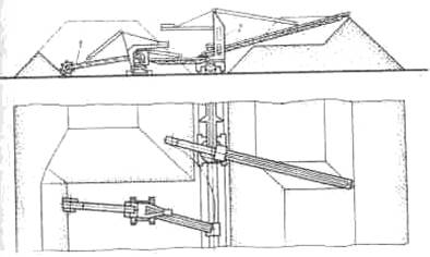 От разгрузочных машин материал может подаваться на оперативный склад отвалообразователем или по транспортерам на тыловой склад грузов открытого хранения (рис. 4), в шатровый склад для грузов крытого хранения. Возможна гравитационная выгрузка из шатрового склада сыпучих грузов (самотеком) на заглубленные транспортеры 2. Для слеживающих грузов используют кратцер-краны со скребковыми транспортерами 1, подающими груз на отгрузочный транспортер.