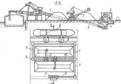 Рис. 1. Крановая схема механизации переработки сыпучих грузов с тыловыми бульдозерами (обратимая схема на погрузку и выгрузку)