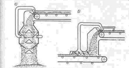 Пылевидные навалочные грузы при переходе из состояния покоя в состояние пересыпания изменяют свою пористость. При этом увеличение порового пространства определяет подсос воздуха, а уменьшение при укладке приводит к выделению воздуха с одновременным захватом пылевидных фракций. Учитывая эту особенность, необходимо использовать системы локализации замкнутого типа. Система обеспыливания узла переброски груза с одного транспортера на другой и пылеподавляющая насадка для загрузки судов с рециркуляцией воздуха при подсосе и выбросе в струе перегружаемого материала приведена на рис. 9. В пылеподавляющей насадке для перегрузки судов система конусов-воронок гасит кинетическую энергию подающей струи, а вытесняемый воздух возвращается к месту подсоса в материал в начале падения.