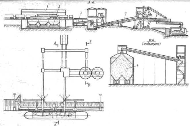 1 – галерея для разгрузки вагонов; 2- приемные бункера с питателями; 3- транспортеры; 4- склад силосный с гравитационной разгрузкой; 5- погрузочная машина.