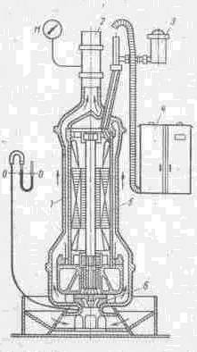 1-корпус насоса, 2-отверстие засасывания нефтепродукта,3-колесо насоса, 4-пост управления насосом, 5- труба с кабелем питания электродвигателя, 6-компенсатор со смазкой для электродвигателя. При перекачке масловязких нефтепродуктов подача насоса до 600 м3/ч