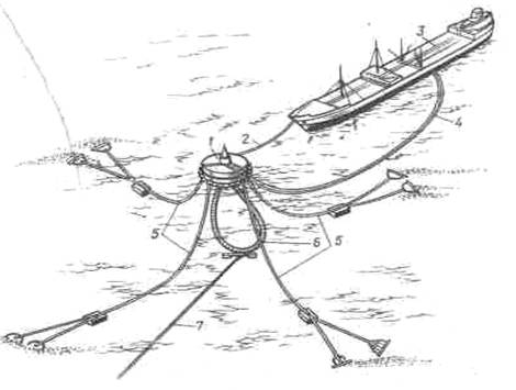 1-швартовая бочка, 2-швартовый канат, 3 – судно, 4-грузовой шланг, 5-якорные тросы, 6-соединительный шланг бочка-трубопровод, 7-подводный нефтепровод.