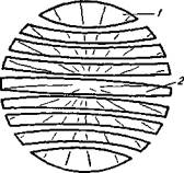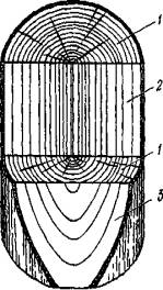 Рис. 2. Усыхание деталей распиленного ствола дерева (коробление): 1 - заболонный участок; 2 - ядровая древесина. дополнительной декоративной отделки тонированием или орнаментальной резьбой. Древесина хвойных пород легко окрашивается, но при интенсивной окраске цветовой тон глушит ее декоративные достоинства. При высыхании древесина сжимается в объеме и подвергается естественному короблению. В столярном деле нужно правильно определять время сушки дерева, так как и недосушенный и пересушенный материал в одинаковой степени непригоден для работы. В условиях эксплуатации с нормальной влажностью среды пересушенная древесина неизбежно впитает влагу с воздуха и покоробится. На нормальное состояние древесины пагубно влияет и переменное изменение температуры: материал при этом трескается. На состояние древесины, ее сушку и разбухание влияет ряд причин: время заготовки, длительность, условия выдержки и т. п. У дерева, заготовленного зимой, древесина (по сравнению с летней заготовкой) менее влажная, так как в этот период оно замедляет свой рост. Необходимо помнить, что недосушивание и пересушивание сильнее всего сказываются на твердых и плотных породах и слабее - на мягких и рыхлых. Для изделия необходимо подбирать древесину однородных по структуре пород, чтобы степень усыхания заготовок была одинаковой. У распиловочного материала при высыхании наблюдаются прогибы и выпуклости (рис. 2), т. е. происходит его коробление. У центровой доски коробление будет едва заметным, так как твердая ядровая древесина усыхает значительно меньше заболони. Пригодность столярного материала в какой-то степени можно определить по наружным признакам ствола сваленного дерева. При отборе древесины обращают внимание на лучевые трещины в торце: отсутствие их или наличие мелких трещин свидетельствует о доброкачественности материала;глубокие трещины являются признаком его низкого качества. При глубоких лучевых трещинах в стволе могут быть полости, которые, например у сосны, заполняются смолянистым веществом - живицей (этот порок сосны называют засмолком). Если трещины идут по годичным слоям древесины, т. е. дугами, то такое дерево непригодно для столярных работ. При выборе древесины мягких хвойных пород обращают внимание на плотность годичных слоев. Чем они гуще и переходы их плавнее, тем древесина плотнее и однороднее, а значит, качественнее. Широкослойность древесины указывает на ее рыхлость и незначительную прочность; изделия из такой древесины не должны подвергаться резким и переменным нагрузкам. Параллельность годичных слоев свидетельствует об относительной прямолинейности древесины в продольном разрезе, а следовательно, о доброкачественности материала. У отдельно растущих деревьев после валки и распиловки можно наблюдать непараллельность древесных волокон, т. е. косослойность. Вместе с косослойностью у таких деревьев ядровая часть смещена к заболони. Древесина с этими пороками больше трескается и сильнее коробится. При отборе древесины следует обращать внимание на возраст дерева. Молодая древесина мягкая и рыхлая, а старая в большей степени подвержена гниению, поэтому лучше всего выбирать древесину среднего, зрелого периода роста. Так, для столярных работ лучшей считается древесина сосны в возрасте 80 .90 лет, дуба - 80 .150, березы и ясеня - 60 