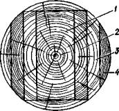 Рис. 3. Схема распиловки ствола дерева: 1 - брус; 2 - обрезная доска; 3 - необрезная доска; 4 - горбыль. Наиболее употребительные размеры пиломатериалов следующие: досок - толщина 13 .45, ширина 80 .250 мм; брусков-соответственно 50 . 100 и 80 .200 мм; брусьев - сечение 130 .250Х130 .250 мм. Длина пиломатериалов - не более 6,5 м. Для столярной заготовки используют обычно необрезные доски, выпиленные ближе к центру ствола. Они в меньшей степени подвержены усадке и высыханию. Для небольших изделий используют и дефектные в целом доски: со сбежистостью, кривизной, трещинами, незначительным косослоем, сучковатостью. Материал для столярных изделий покупают в магазинах. Но не следует забывать, что для их изготовления можно использовать старую мебель, тарную дощечку, отходы пиломатериалов, старый паркет, элементы разбираемых деревянных построек, балочных перекрытий и т. д. Продуктами переработки древесины являются строганый и лущеный шпон, фанера, древесностружечные и древесноволокнистые плиты. Строганый и лущеный шпон служит материалом для облицовочных и мозаичных работ. В магазины шпон поступает с деревообрабатывающих комбинатов или мебельных фабрик в пачках различной длины и ширины. Получают его при строгании или лущении древесины: лущеный-березы, ольхи, ели, сосны, бука, липы и других пород со слабовыраженной текстурой, строганый - грецкого ореха, ясеня, бука и т. д. Строганый шпон используют, как правило, для облицовывания мебели, а лущеный - столярных и древесностружечных плит. Для облицовывания рекомендуется шпон толщиной 0,6 .1,5 мм. Кроме строганого и лущеного шпона, для облицовывания изделий в столярном деле используют еще пиленый шпон толщиной от 1 до 12 мм. Такой шпон получают, распиливая древесину обыкновенной одноручной пилой с соответствующим разводом зубьев. Пиленый шпон используют для облицовывания небольших изделий. Фанера состоит из нескольких (три, пять и более) склеенных слоев лущеного шпона. Основными породами древесины, используемой для изготовления фанеры, являются ольхе, береза, бук, сосна, липа и др. В продажу фанера поступает шлифованной и нешлифованной с маркировкой согласно применяемым клеевым составам. Фанеру применяют в качестве конструкционного и облицовочного материала. Оклеивают ее строганым шпоном ценных пород - дуба, ясеня, березы, бука, грецкого ореха, красного дерева, клена и т. д. Вместо шпона фанеру можно облицовывать декоративными пленками или декоративной бумагой. Толщина фанеры - от 3 до 18 мм. Столярные плиты - это склеенные между собой рейки, облицованные лущеным шпоном или фанерой. Для облегчения конструкций изготовляют также плиты, в которых рейки размещены блоками с образованием пустот. Щиты, изготовленные таким образом, не гнутся и не трескаются. Толщина столярных плит - 16 .50 мм. Мастер может изготовить столярную плиту сам, используя соответствующие материалы и инструмент. Столярные плиты используют для изготовления предметов мебели. Древесностружечные плиты (ДСП) изготовляют из древесины и ее отходов, которые измельчают, сушат, сортируют, смешивают со связующим, формуют и при определенном давлении и температуре прессуют. Толщина плит - 10 . 20 мм. Плиты бывают водостойкие и неводостойкие, разной плотности, шлифованные и нешлифованные. ДСП применяют в основном для устройства перегородок, обшивки каркасов конструкций и 