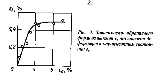 При первом нагреве происходит частичное восстановление исходной формы (кривая 7). При 180 °С деформация восстановления формы е, = 0,9 %. В процессе охлаждения происходит частичный возврат к форме, заданной первоначальной деформацией (е, и 0,5 %). При дальнейшем термоцикли-ровании кривая формоизменения стабилизируется, повторяя кривую охлаждения 2 с практически нулевым гистерезисом .Зависимость величины обратимого эффекта памяти формы е; от деформации в мартенситном состоянии приведена на рис. 2. Видно, что при малых значениях е,, эта зависимость линейная. При e > 4 % величина е; не изменяется, что согласуется сданными работы [I].
