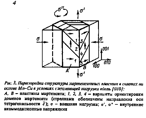 Согласно [б], при ГЦК -» ГЦТ-превращении в Mn-Cu-кристалле образуются пластины мартенсита, граничащие по плоскостям {110}. Каждая из пластин состоит из мартенситных доменов двух вариантов со взаимно перпендикулярными тетрагональными осями с . Домены имеют двойниковую ориентацию с плоскостями двойникования {110}, составляющими угол 60° с границами мартенситных пластин. Границы двойников легко подвижны и при приложении внешних напряжений перемещаются внутрь неблагоприятно ориентированного двойника. Это приводит к формированию мартенситной текстуры с преобладанием доменов с осью вдоль направления сжатия. Однако при неблагоприятной ориентировке мартенситной пластины, для которой направление деформации параллельно плоскости двойникования, перемещение существующих границ двойников невозможно (фактор Шмида равен 0).