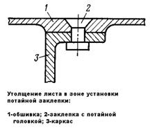 Способ С потайной клепки характеризуется тем, что гнезда для головок заклепок в тонкой обшивке штампуют, а в более толстом каркасе – зенкуют. Этот способ применяется когда