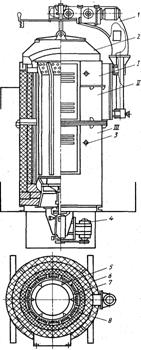 На рисунке 18 показана шахтная электропечь типа СШО, СШЗ с температурой нагрева до 700 °С. Печь работает с окислительной или защитной атмосферой и представляет собой каркас, футерованный огнеупорными и теплоизоляционными материалами. Сверху печь перекрывается поворотной крышкой с механизмом подъема и поворота. Вентилятор расположен внизу печи. Нагреватели размещены на боковых стенках печи. Между нагревателями и обрабатываемыми деталями или изделиями имеется экран с направляющими для предохранения его от повреждений при загрузке изделий (например, в виде бунтов). Для обеспечения равномерности нагрева печь разбита по высоте на три температурные зоны I-III. Температуру измеряют термопарами. Разъем между печью и крышкой уплотняют с помощью песочного затвора.