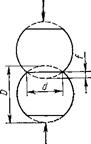 Стандартная методика предусматривает свободную засыпку керамзитового гравия в цилиндр и затем сдавливание его с уменьшением первоначального объема на 20%. Под действием нагрузки прежде всего происходит уплотнение гравия за счет некоторого смещения зерен и их более компактной укладки. Основываясь на опытных данных, можно полагать, что за счет более плотной укладки керамзитового гравия достигается уменьшение объема свободной засыпки в среднем на 7%. Следовательно, остальные 13% уменьшения объема приходятся на смятие зерен (рис.1).Если первоначальная высота зерна D, то после смятия она уменьшается на 13%.