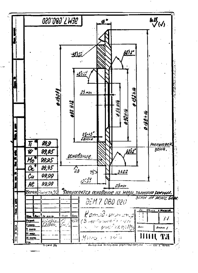 В начале из пластины вырубается диск диаметром на (2 4)мм больше диаметра готовой мишени. Механическая обработка пластин на заданный размер мишени-диска производится на токарном станке типа 1К-62 в следующей последовательности. Затем, зажимая в патроне, обрабатываются плоскости до заданной толщины подрезным резцом.
