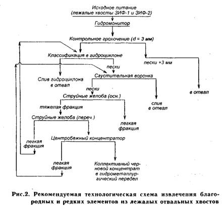 Испытаниями на центробежных концентраторах Нельсона показана возможность получения из отвальных хвостов ЗИФ-2 черновых коллективных концентратов благородных и редких элементов с содержанием золота 200 г/т при извлечении его до 50-55%, а сопутствующих ему элементов до 50-54%. Ранее проведенными полупромышленными испытаниями на струйных желобах (конусных сепараторах) [1] показана возможность достижения высокого извлечения золота в тяжелую фракцию. Наиболее эффективно на конусных сепараторах происходит разделение частиц по плотности при соотношении Т:Ж 1:1-1:1,2. Такая консистенция тяжелой фракции наиболее подходит для последующего передела — обогащения на центробежных концентраторах, где разжижение исходного питания не должно превышать 1:3. Таким образом, узел обогащения на струйных желобах выполняет две функции — предконцентрации и уменьшения объема продукта, поступающего в основной доводочный передел. На основании результатов исследований [1], а также опытов, проведенных на хвостах ЗИФ-1 и ЗИФ-2, можно с. уверенностью констатировать, что извлечение благородных и редких металлов в этой операции составит не менее 65-70%. Таким образом, для обогащения лежалых хвостов можно рекомендовать технологическую схему (рис.2), использующую два основных приема гравитационного • обогащения — конусные сепараторы (струйные желоба) и центробежные концентраторы — и позволяющую повысить общее извлечение золота на 10-15% и попутно, без дополнительных затрат, получить товарные черновые концентраты редких металлов с извлечением от 25 до 35%.[10]