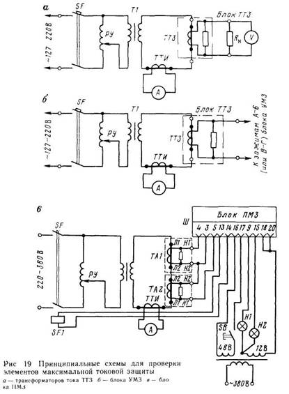 Измерения тока следует выполнять с помощью лабораторного трансформатора тока и амперметра с верхними пределами измерения 5—10 А и классом точности 0,5—1,5. Фактические токи уставок срабатывания проверяют по испытательной схеме (рис. 19, б), к которой вместо нагрузочного сопротивления подключают входы блока УМЗ. Секции блока УМЗ (второй силовой фазы) испытыва-ются поочередно. Тумблеры блока должны находиться в положении «Работа». На испытуемой секции блока УМЗ устанавливают уставку тока срабатывания, а регулятором — минимальное выходное напряжение. Включают выключатель и с помощью регулятора плавно повышают первичный ток трансформатора ТТЗ до срабатывания исполнительного реле блока УМЗ (определяется по характерному щелчку). Оставив рукоятку РУ в том же положении, отключают выключатель, взводят контактную группу блока УМЗ и повторно включают выключатель, т. е. толчком подают первичный ток. Если при этом реле УМЗ не срабатывает, то проверку повторяют, снижая первичный ток и затем плавно увеличивая его до момента срабатывания блока УМЗ. Проверка должна быть произведена не менее 3 раз.