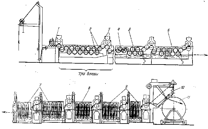 Выщелачиватели 7 с пароводяной промывкой дополнительно интенсифицируют обработку за счет заправки петля в петле, благодаря которой увеличивается длинна заправки и длительность обработки. На дне выщелачивателя установлены обычные перегородки, обеспечивающие противоток моющего раствора, который поступает в первую промывную ванну и насосами подается на спрыски, циркулируя до насыщения (60 г/л). Сверху выщелачиватель закрыт двумя легкими откидными крышками. Последние ванны для нейтрализации кислотой 8 и прополаскивания водой 9 также имеют заправку петля в петле, что повышает интенсивность обработки.