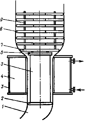 Накопитель – основной рабочий орган, в котором происходит обработка полотна раствором щелочи.Вверху накопитель имеет входную головку 6 с соплами, через которые на полотно подается подогретый в теплообменнике 5 раствор щелочи. Сопла обеспечивают быстрое и активное пропитывание полотна раствором. Для хранения запаса раствора щелочи служит резервный бак 1.