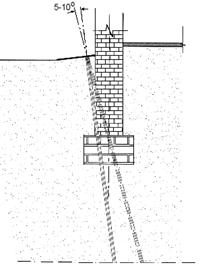 При усилении существующих фундаментов конструктивные решения практически аналогичны тем, что применяются для буроинъекционных свай, изготовляемых по традиционной технологии и сводятся, в основном, к трем схемам, приведенным на рисунках 1-3. На рисунках 1 и 2 приведены схемы устройства так называемых "козловых" свай, когда они забуриваются под некоторым углом через тело существующего фундамента либо с двух сторон стены, либо с одной. В последнем случае сваи устраиваются через одну с разным углом наклона.