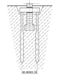 Значительно реже применяется схема, приведенная на рисунке 3. Пробуренные вертикально вдоль фундамента сваи воспринимают нагрузку от здания через специально закрепленные в теле фундамента траверсы.