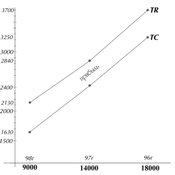На следующем графике наглядно изображено изменение общей выручки, общих издержек и прибыли.