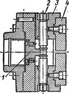Двухкулачковый патрон ручного действия. Такой патрон применяется для закрепления небольших заготовок, при установке которых не требуется точного центрирования. Вращением винта 2 , имеющего на одном конце правую, а на другом — левую резьбу, перемещают кулачки патрона. Подшипник 1, охватывающий шейку винта, исключает осевые смещения последнего. К основным кулачкам 3 патрона крепятся винтами наклонные кулачки 4, форма рабочих поверхностей которых выбирается в соответствии с формой обрабатываемой заготовки.