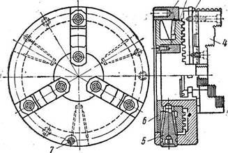 Обрабатываемая заготовка зажимается кулачками 4, скрепленными с рейкой 3, входящей в зацепление со спиралью, нарезанной на переднем торце конической шестерни 2. Вращением ключом одного из трех зубчатых колес 5 перемещают кулачки 4 в Т-образных пазах корпуса. Зубчатые колеса 1 расположены равномерно по окружности патрона в отверстиях корпуса и закреплены в нем шпильками 7. Крышка 6 ограничивает перемещение шестерни в осевом направлении. Шестерня 2 установлена в корпусе так, что зазор между ее торцом и крышкой составляет 0,02—0,05 мм. Продольные боковые выступы на рейке служат направляющими для кулачков, которые крепятся к рейке винтами.
