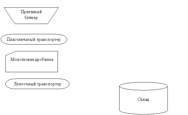 В приемный бункер гипсовый камень доставляют из рудников и карьеров в кусках и глыбах. Из приемного бункера известняк при помощи пластинчатого транспортера поступает в молотковую дробилку. Так как во время дробления образуется большое количество мелкой фракции, то после дробилки материал поступает на грохочение. На грохоте известняк делится на три фракции: 40…70 40…20 и < 20.