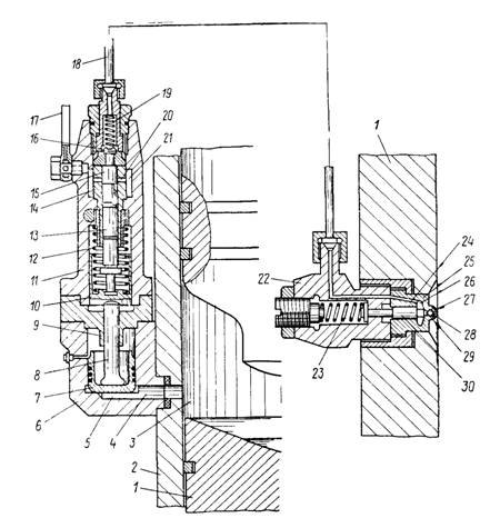 6—нижняя часть корпуса насоса; 7 — поршень; 8 — толкатель, 9 — средняя часть корима корпуса топливного насоса; 10—подвижная втулка; 11 — верхняя часть корпуса топливного насоса, 12, 23 — пружина; 13— плунжер; 14 — втулка; 15 — подплунжерная полость 1Ь — клапан- 17 — топливопровод; 18— напорный топливопровод; 19—пружина, 20 - отверстия, 21, 26, 27 — полость; 22 — корпус форсунки; 25 — наконечник;26—сопловое отверстие; 29 — коническая часть иглы; 30—игла.