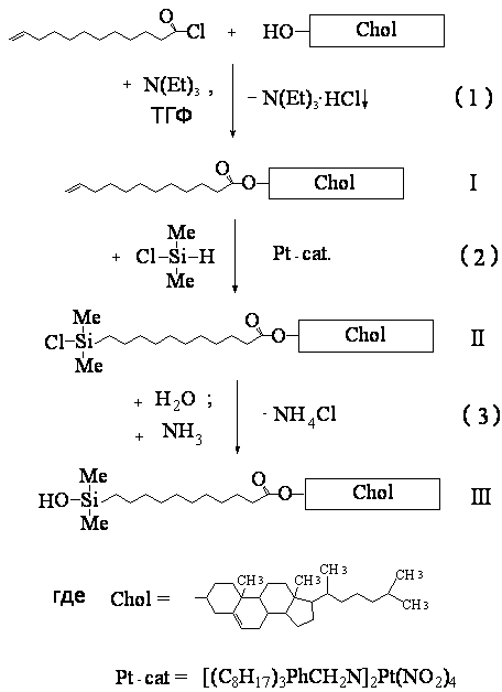 Синтез соединения III включает в себя три химические стадии (схемы (1), (2) и (3)). Холестериновый эфир 10-ундециленовой кислоты I, был получен по стандартной методике ацилированием холестерина хлорангидридом 10-ундециленовой кислоты (схема (2)), температуры фазовых переходов совпадают с литературными данными [[44]].