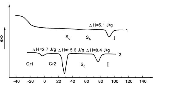 Для более подробного изучения фазового полиморфизма этого ЖК дендримера обратимся к результатам калориметрических исследований, представленных на рис. 37.