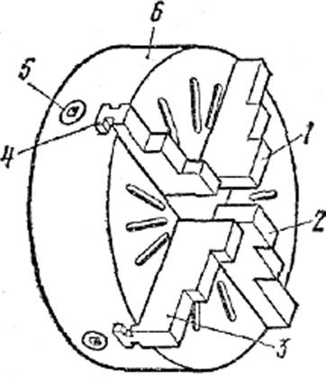 Так как каждый кулачок четырехкулачкового несамоцентрирующего патрона перемещается отдельно от остальных (рис. 3), то имеется возможность для установки и закрепления несимметричных заготовок. Все четыре кулачка 1 .4 установлены в пазах корпуса 6, Каждый кулачок перемещается отдельно винтом 5 иезави симо от остальных. Кулачки патронов обычно бывают закаленными. Но при зажиме заготовок такими кулачками на обработанных поверхностях остаются следы в виде вмятин.