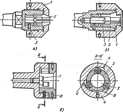 Внутренняя поверхность роликового самозажимного патрона 4 имеет участки А, В, С (рис. 4, в), обработанные эксцентрично по отношению к оси патрона. В них упираются ролики 5, расположенные в пазах втулки 2, которая может быть повернута на некоторый угол с помощью стержня, находящегося в одном из радиальных гнезд. Угол поворота втулки ограничен винтом, ввернутым в корпус.