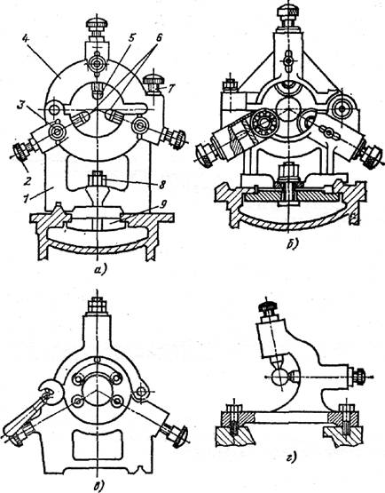 Люнеты бывают неподвижные и подвижные. Неподвижный люнет (рис. 7, а) состоит из чугунного корпуса /, на котором болтом 7 крепится откидная крышка 4, что облегчает установку заготовки. Основание корпуса имеет форму соответствующую направляющим станины, на которых люнет закрепляется планкой 9 и болтом 8. В корпусе с помощью регулировочных болтов 2 и винтов 3 перемещаются два кулачка 6, а в крышке — один кулачок 5. Для закрепления кулачков в требуемом положении служат винты 3. Такое устройство позволяет устанавливать в люнет валы различных диаметров. Кулачки иногда заменяют роликами для уменьшения трения.