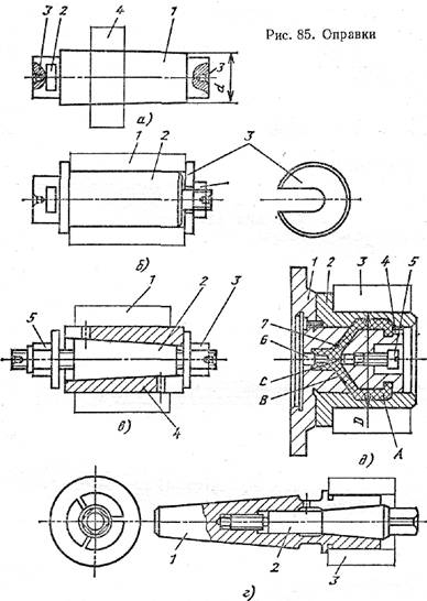 Шпиндельная оправка (рис, 8, г) имеет конусную часть 1 и разжимную часть типа цанги, на цилиндрическую поверхность которой надевают заготовку 3. Оправку конусной частью вставляют в шпиндель. Зажим заготовки производят конической частью болта 2.