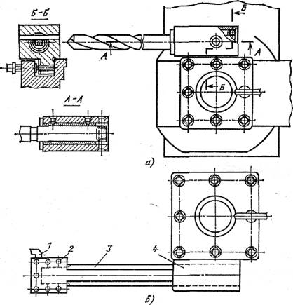 Оправка для установки сверл и другого концевого инструмента показана на рис. 9, а. Оправка устанавливается в ту позицию резцедержателя, которая имеет соответствующую маркировку инструмента. Резцовая оправка для обработки деталей над выемкой в станине (рис. 9, б) применяется на станке 16К20 при обработке деталей диаметром до 600 мм и длине 295 мм от торца фланца шпинделя для предотвращения свисания ка ретки с направляющих станины. Оправку 3 устанавли вают в держатели 4, а резец 1 крепят винтами 2.