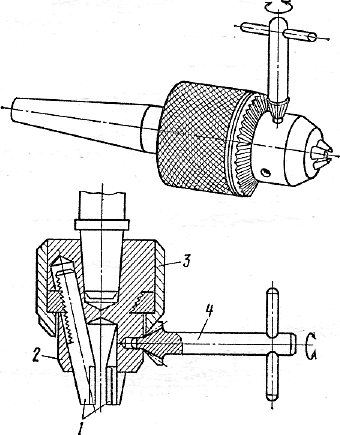 Сверлильные патроны используют для крепления сверл, разверток с цилиндрическим хвостовиком диа метром до 20 мм. Трех кулачковый сверлильный патрон (рис. 10) состоит из корпуса патрона, в котором распо ложены наклонно три кулачка 1, имеющие резьбу, свя зывающую их с гайкой 2. Обойма 3 вращается клю чом 4, вставленным в отверстие корпуса патрона. Зажим ные кулачки, опускаясь вниз, сходятся и зажимают цилиндрический хвостовик сверла. Для зажима сверл не большого диаметра с цилиндрическим хвостовиком при меняют цанговые патроны.