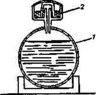 Рис. 2. Бродильный шпунт, установленный в шпунтовое отверстие бочки: 1 — бочка деревянная; 2 — шпунт (затвор)
