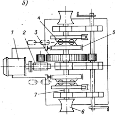1 - двигатель; 2 - червячный редуктор; 3 - цилиндрические шестерни; 4 - цепная звездочка; 5 - ленточный тормоз; 6- турачка (швартовный барабан); 7- грузовой вал.