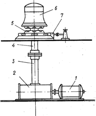 1 - электродвигатель; 2 - редуктор (червячный); 3 - вертикальный вал; 4 - грузовой вал; 5 - цепная звездочка; 6-швартовный барабан; 7 - колодочный тормоз.
