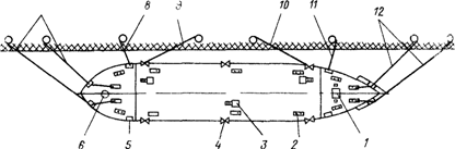 1 - брашпиль со швартовными барабанами; 2 - кнехт; 3 - швартовная лебедка; 4 - швартовный клюз; 5 - киповая планка; 6 - швартовный шпиль; 7 - кормовой про дольный швартов (правый и левый); 8 - кормовой прижимной швартов; 9 - кормовой шпринг; 10 - носовой шпринг; 11 - носовой прижимной швартов; 12 - носовые про дольные швартовы (правый и левый).