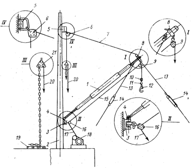 1 - стрела; 2 - мачта; 3 - башмак шпора; 4 - вертлюг шпора; 5 - обух топенанта; 6 - блок топенанта; 7 - топенант; 8- обух нока; 9 - грузовой блок; 10 - противовес; 11 - вертлюг; 12 - гак; 13 - оттяжка; 14 - тали-оттяжки; 15 - грузовой шкентель; 16 - направляющий блок; 17 - конец к лебедке; 18 - грузовая лебедка; 19 - палубный обух топенанта; 20 - конец к канифас-блоку; 21 - треугольное звено.