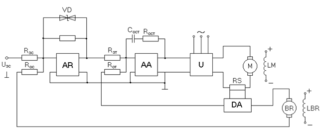 Рис. 8. Принципиальная схема подчиненного регулирования тока и скорости в системе ТП-Д.