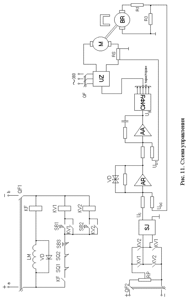 Схема управления электроприводом выполнена на базе операционных усилителей постоянного тока и включает в себя регулятор тока (АА), регулятор скорости (AR), датчик интенсивности SJ. Тахогенератор BR с делителем напряжения R3 и R1 является датчиком скорости. Сигнал задания формируется в блоке задания. Уровень сигнала задания изменяется потенциометром RP, а его полярность задается с помощью реле KV1 и KV2 (движение вперед и назад). Реле KF – реле обрыва поля.
