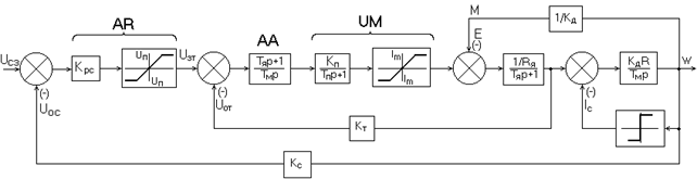 Пропорциональный регулятор скорости AR и пропорциональный регулятор тока AA формируют управляющие воздействия из сигналов задания Uсз и Uзт и обратных связей Uос и Uот.