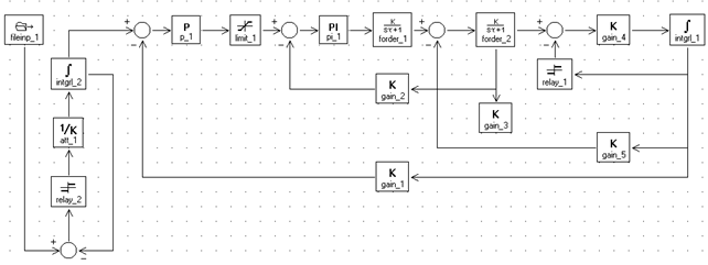 Для построения переходных процессов пуска электропривода в замкнутой системе с подчиненным регулирования координат, используем ЭВМ и программу 20-sim. Для моделирования введем в компьютер схему, представленную на рис. 14.