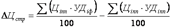 Расчет влияния структурного фактора на изменение выпуска продукции в стоимостном выражении можно произвести и с помощью средневзвешенных цен (если продукция однородная). Для этого сначала определяется средневзвешенная цена при фактической структуре продукции, а затем при плановой и разность между ними умножается на фактический общий объем производства продукции в условно-натуральном выражении: